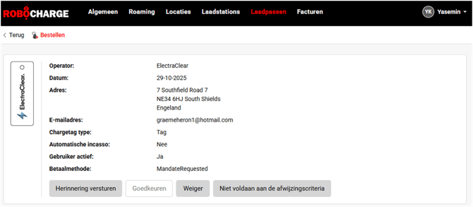 4. Zie hieronder een afbeelding waar je een aanvraag kan Goedkeuren, Weigeren of een herinnering kan sturen om de automatische incasso aan te zetten.