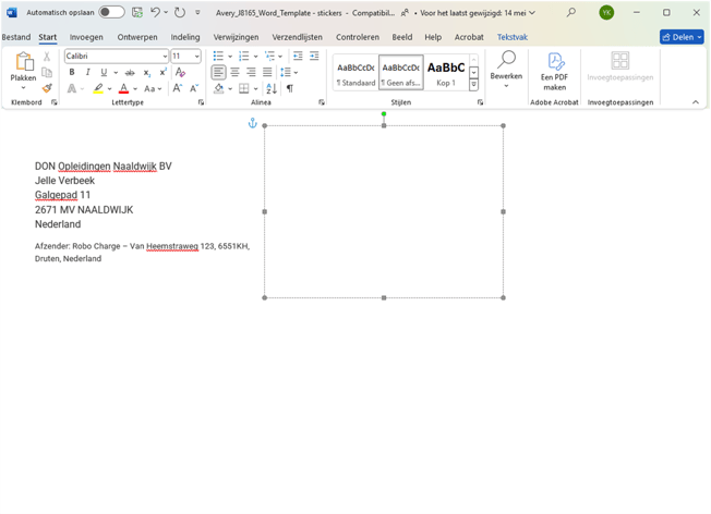 7. Om een adres sticker te maken voor de envelop ga je naar de documenten in de one drive → Robocharge BV → General → Support → Chargetags → Templates → Avery_J8165_Word_Template - stickers laad tags