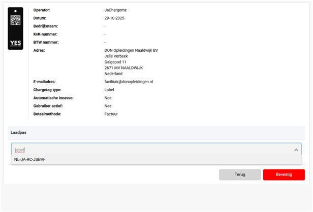 Dan vul je de RFID code in die op de laad tag staat (zie foto 1 & 2), dit bevestig je door op de rode bevestig knop te drukken.
